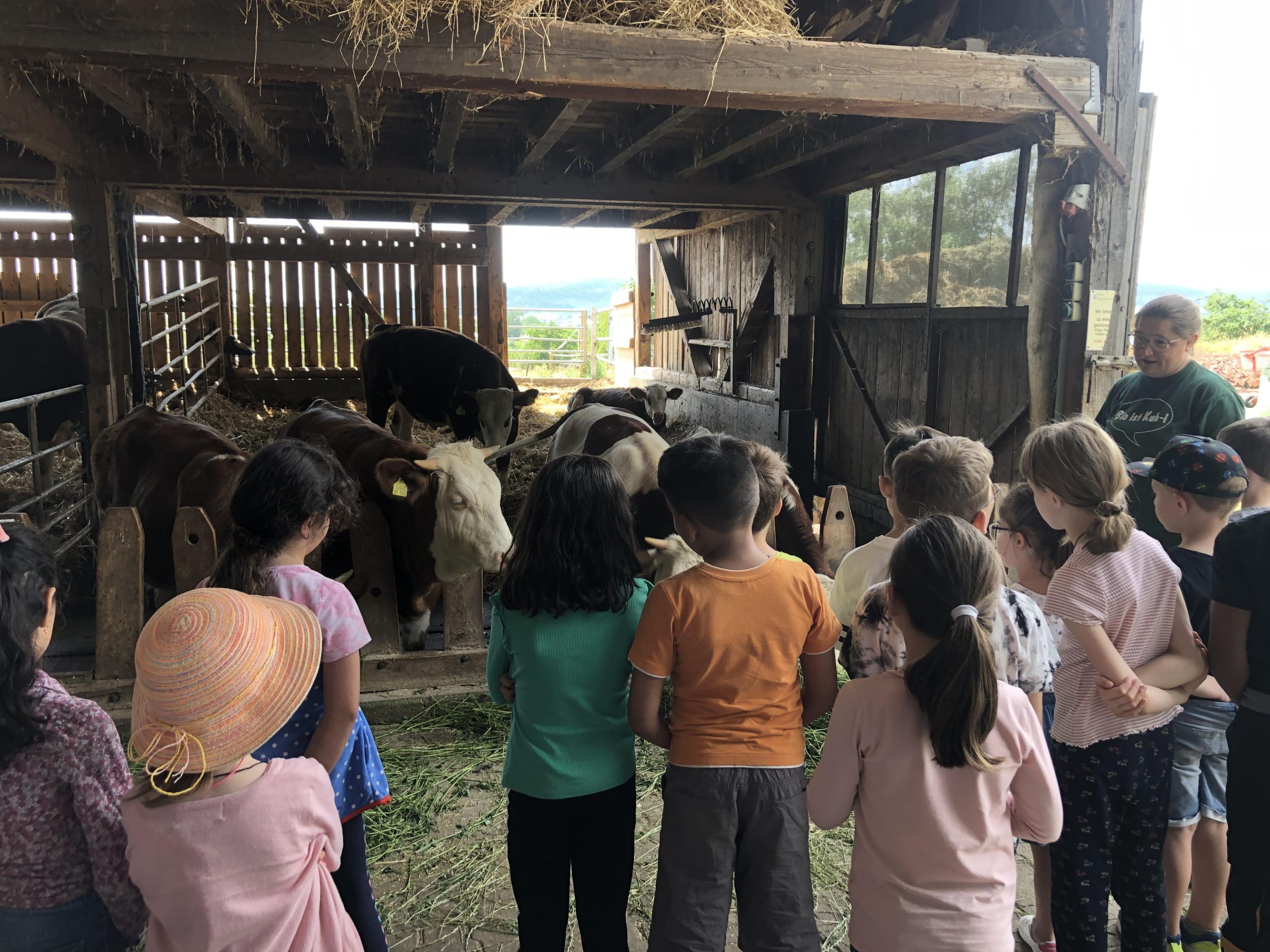 An verschiedenen Station bekamen wir die Möglichkeit, die Kühe, Bullen und Kälber aus der Nähe zu betrachten. Frau Lechner erklärte uns die Unterschiede zwischen ihnen und wie sie auf dem Hof aufwachsen. Wir durften sogar einige der Kälber streicheln, was für uns alle ein aufregendes Erlebnis war.