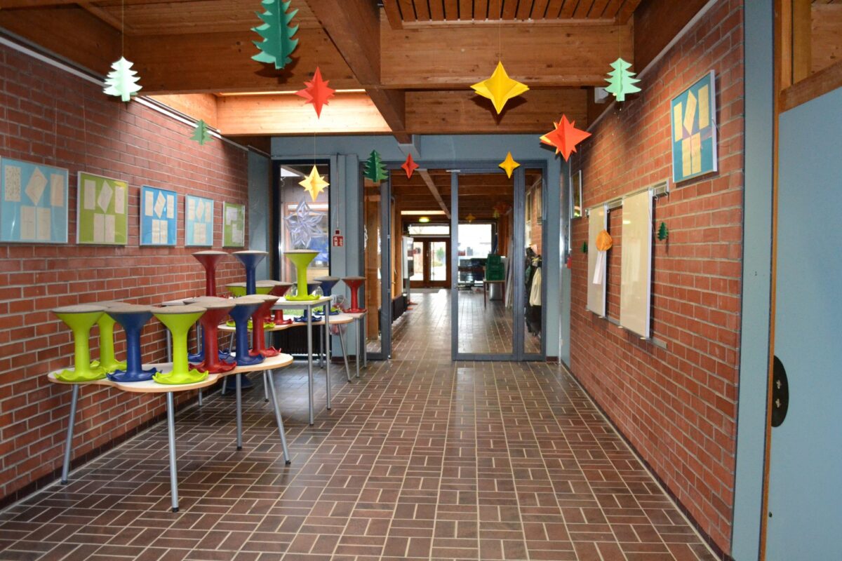 Da jeder Unterricht auf mehreren Ebenen differenziert werden kann, sich individuelle mit kooperativen Arbeitsphasen abwechseln und manchmal ganze Gruppen separate Inputs erhalten, sind viele Räume und Gänge mit zusätzlichen Arbeitsplätzen ausgestattet. Tische, wie hier im Bild, gibt es in jedem unserer Gänge und sie können für Kleingruppen- oder Stillarbeit genutzt werden. Zudem wird, nach aktueller Raumlage, jeder Klassenstufe ein Differenzierungsraum zugewiesen. So können beispielsweise Teile der Klasse auf unterschiedlichen Niveaus in ein neues Thema eingeführt werden, um später wieder gemeinsam zu arbeiten.