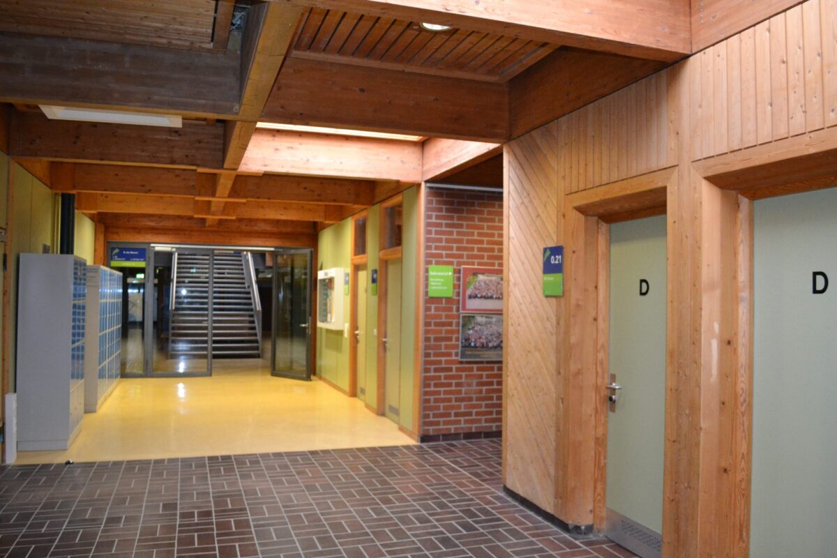 Als Gemeinschaftsschule sind wir gebundene Ganztagsschule. Das bedeutet, dass an drei Tagen in der Woche (Montag, Dienstag und Donnerstag) die Schülerinnen und Schüler ab ihrer ersten Stunde bis nach dem Mittagsunterricht an der Schule sind. Mittwochs gibt es ein freiwilliges AG-Angebot am Nachmittag. Am Freitag endet der Unterricht für alle spätestens nach der sechsten Stunde. Daher haben wir mietbare Schließfächer für Wertgegenstände und zusätzlichen Stauraum (z.B. hier links in blau).