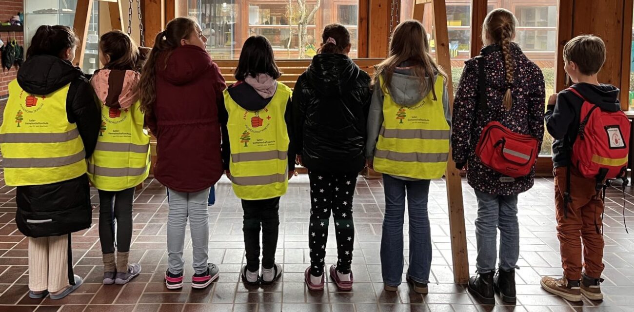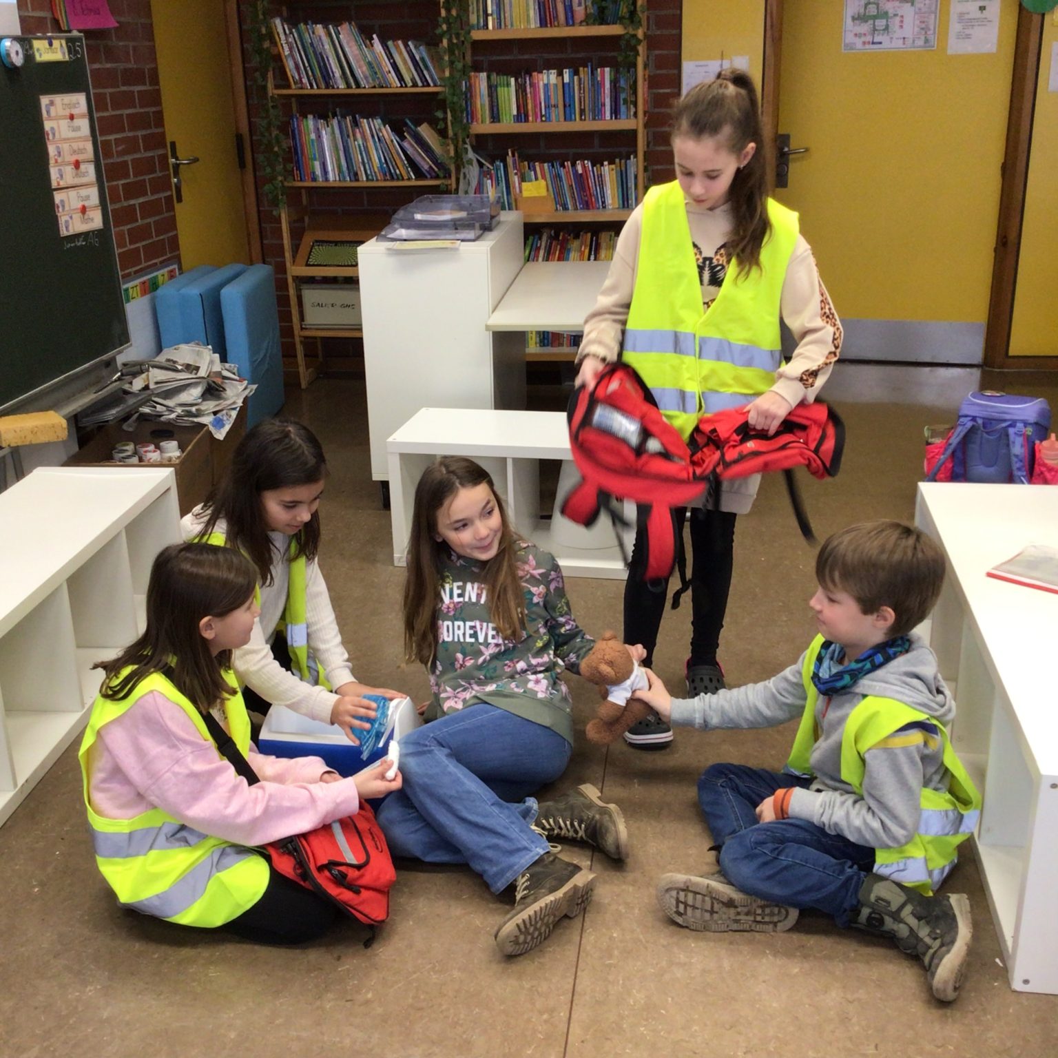 Die in der AG „Kinder helfen Kinder“/ „Juniorhelfer“ ausgebildeten Schüler und Schülerinnen haben anschließend in Kleingruppen „Dienst“ und kommen in der Pause zum Einsatz. Vom DRK bekamen wir hierfür eigene Sanitätstaschen und Westen.