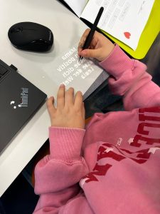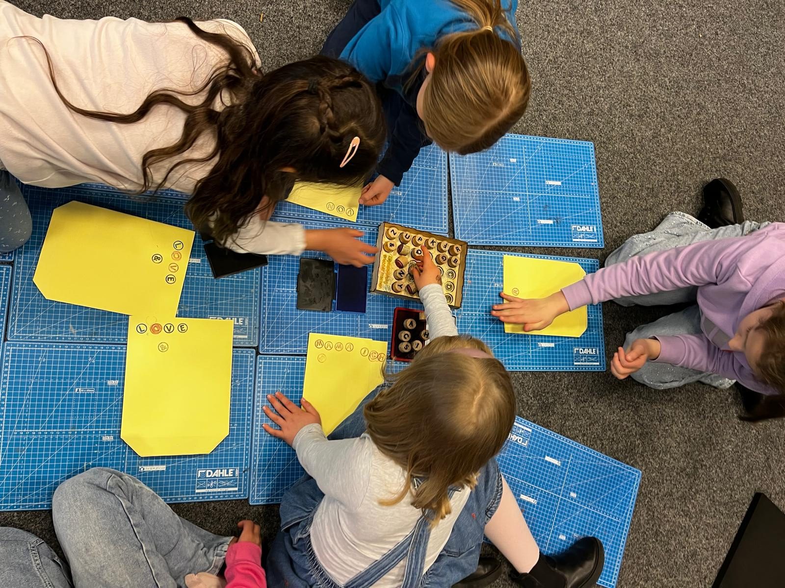 Im Kreismedienzentrum durften die Kinder ihre Texte zunächst am Computer abtippen und individuell gestalten. Mit viel Konzentration wurde formatiert, ausprobiert und verbessert. Bevor die Texte an den Plotter geschickt wurden, überprüften die Kinder gemeinsam noch einmal alles ganz genau – schließlich sollte das Geschenk perfekt werden.